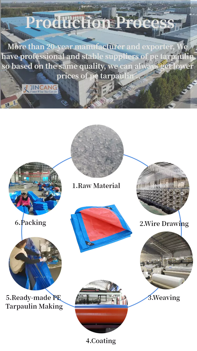 Jincang е един от професионалните производители на рула PE брезент в Китай, 90 GSM лента PE брезент ролка е пакет по ролка. Ширината обикновено е 1,83 м, 2 м, 4 м, 5 м, 6 м. Дължината обикновено е 63 м, 91, 100 м 200 м и т.н. И ние също можем да персонализираме според вашите изисквания. Използва се широко за външна защита, покриване на стоки, строителни обекти, селскостопански цели и временни убежища.